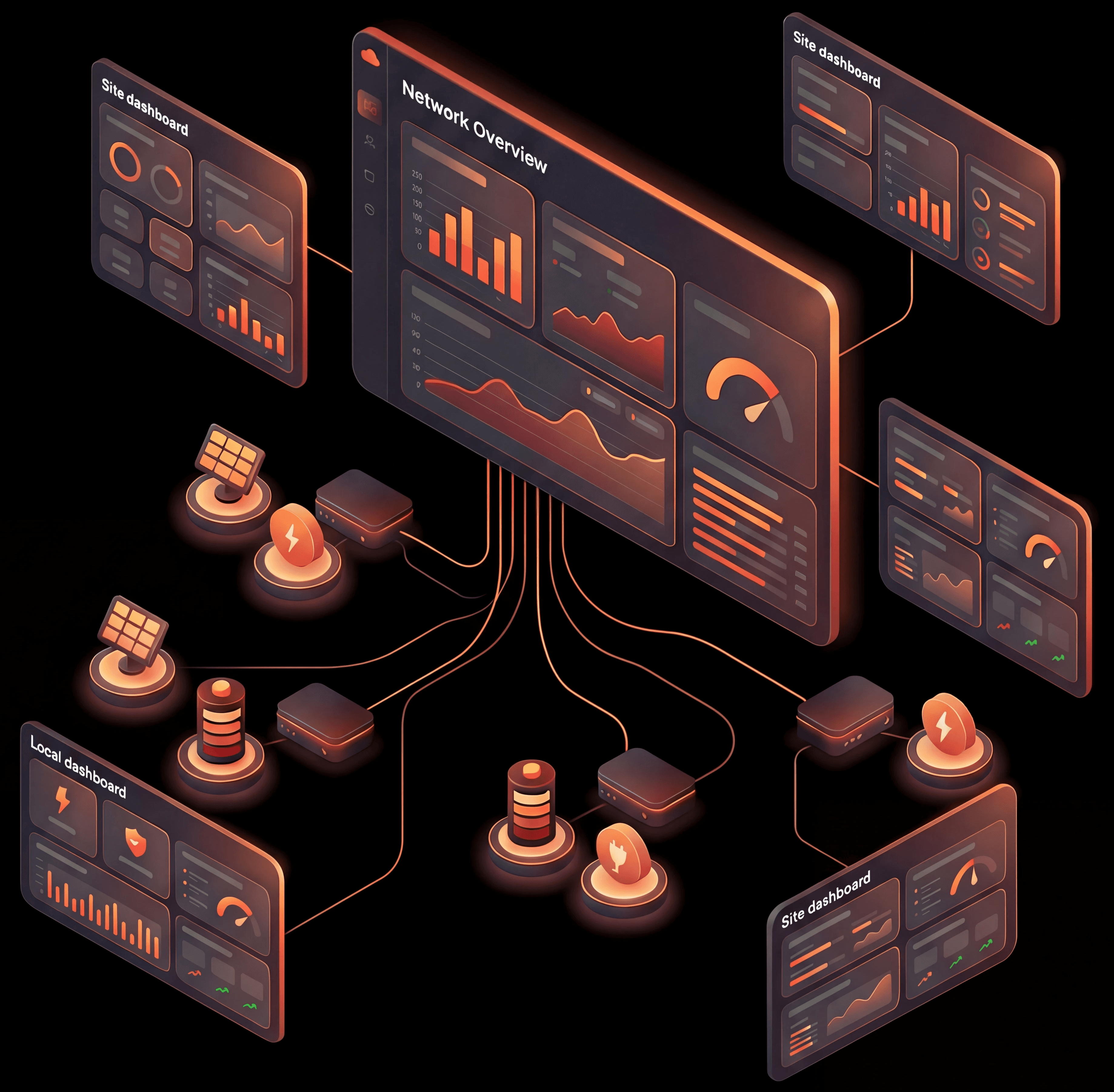 Az Oryx SCADA nemcsak egy telephely, hanem akár országos vagy nemzetközi hálózatok energiafolyamatait is képes megjeleníteni. A termelés, fogyasztás és tárolás minden helyszínen valós időben követhető, egységes vagy telephelyenkénti bontásban. A platform támogatja a régiós, országos és csoportszintű riportálást, miközben fejlett jogosultságkezeléssel biztosítja, hogy minden döntéshozó a számára releváns adatokat lássa.