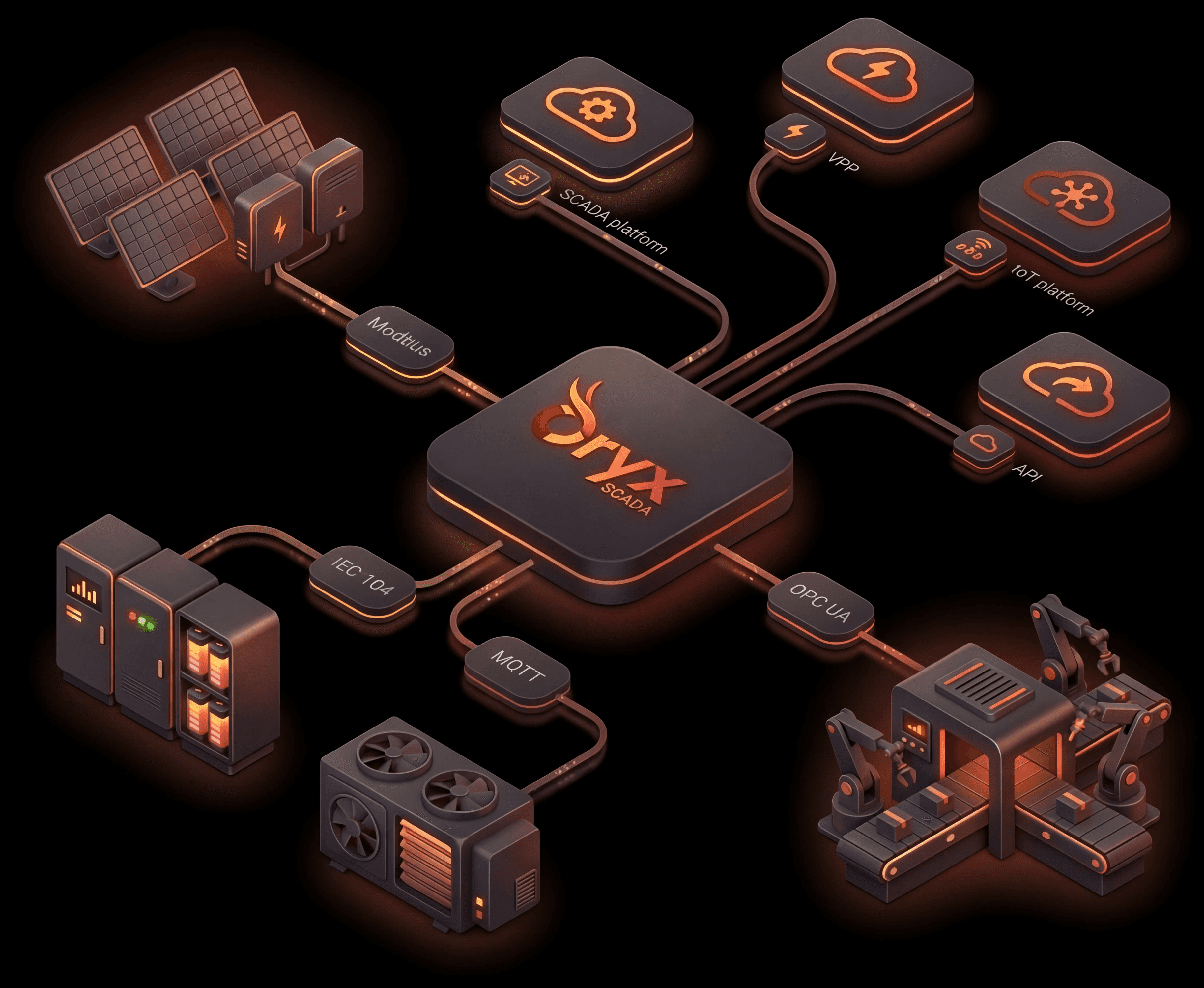 Az Oryx SCADA bármilyen energiatermelő, tároló vagy fogyasztó berendezéssel képes együttműködni a szabványos és az egyedi ipari protokollokon (Modbus, IEC104, MQTT, OPC UA, SNMP) keresztül egyaránt. Integrálható ERP, CRM, BMS és MES rendszerekkel, valamint meglévő SCADA és IoT platformokkal is. Az API szintű adatkapcsolatoknak és a gyártósori, HVAC vagy ipari gateway integrációknak köszönhetően a teljes energetikai infrastruktúra valós időben, egységesen felügyelhető.